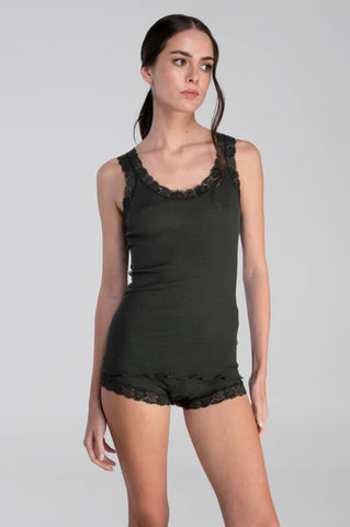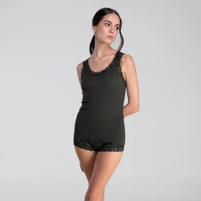 Top senza maniche realizzato con una preziosa e naturale miscela intima di lana Merino extra fine e seta pura di alta qualità con il pizzo francese leavers più elegante e femminile, certificato e numerato come vera “Dentelle de Calais®”.