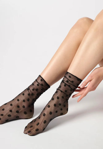 Calzino leggero e versatile, disponibile in due raffinati motivi: floreale e rete con effetto argento. Realizzato con filato sottile e confortevole, può essere indossato anche rimborsato per un look moderno e originale. Il polsino a taglio vivo dona una finitura pulita e discreta, perfetta per ogni stile.