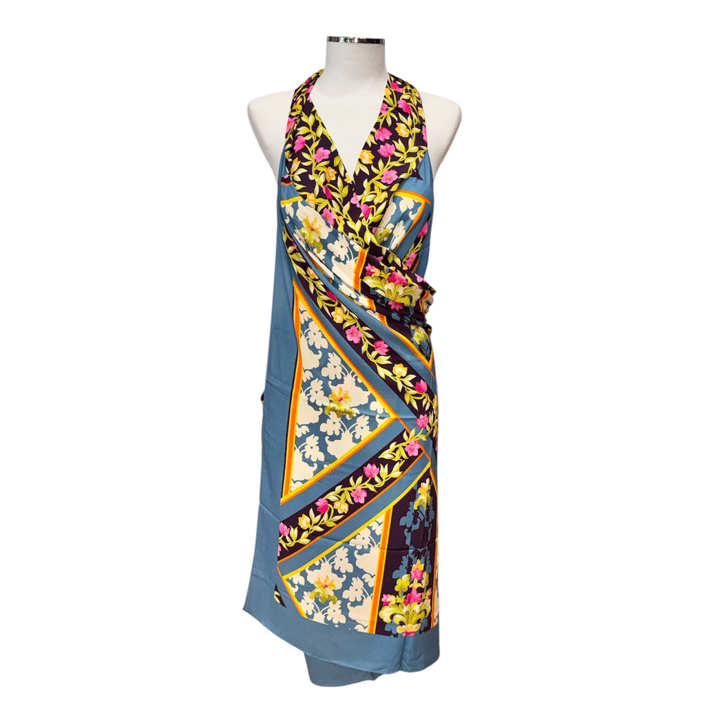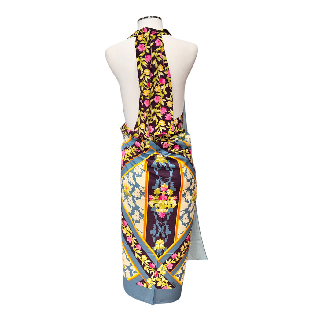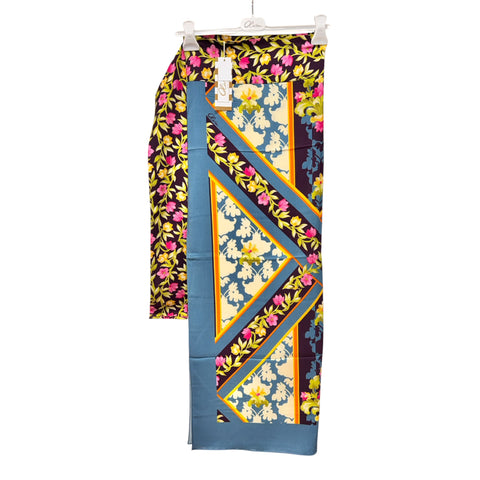 Pareo fantasia in leggerissimo tessuto di viscosa. Ha una fascia lungo il bordo che lo chiude a mo' di gonna pareo con un fiocco o che può trasformarlo quasi in un abito