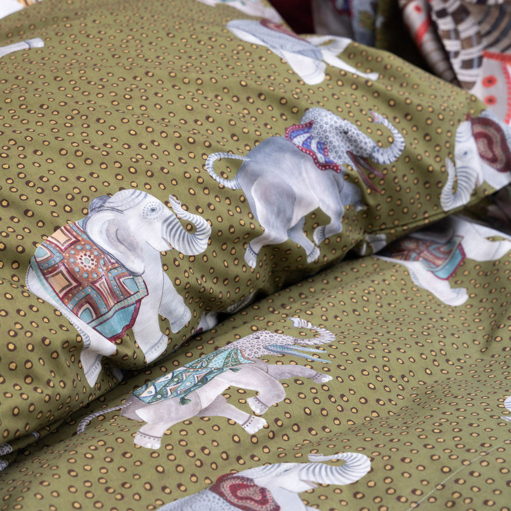 Munai, un lenzuolo stampato in percalle di puro cotone, arreda la tua camera con un tocco di eleganza tropicale. Lasciati trasportare nel folto della giungla amazzonica con gli elefanti della foresta.