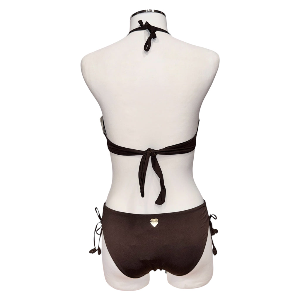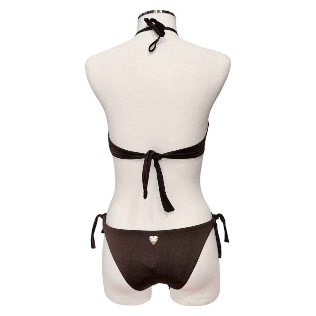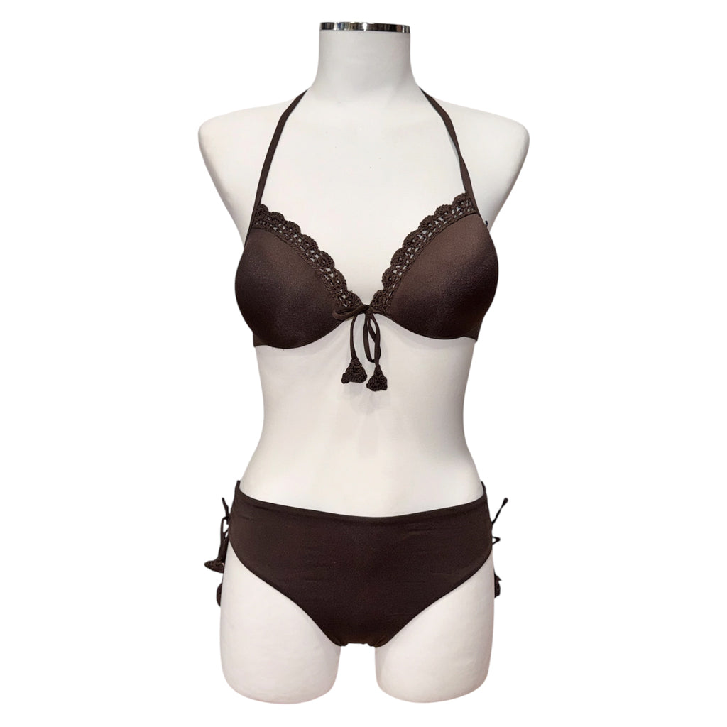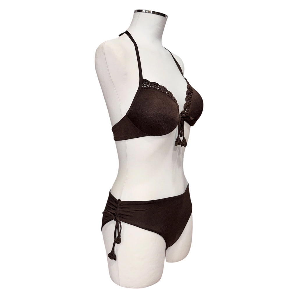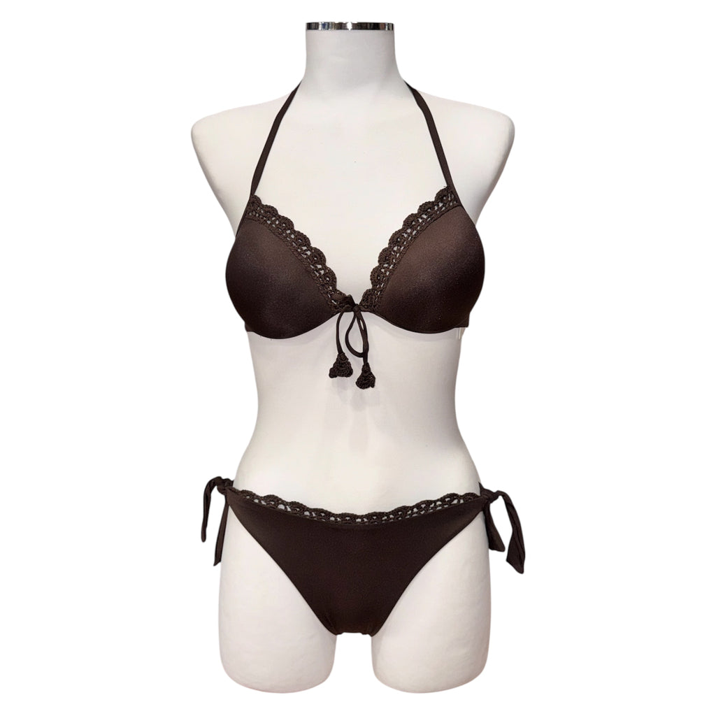 Bikini in tessuto satin con coppe rifinite con profili in crochet di cotone smerlato e fiocchetto centrale con nappine. Le bretelle si possono annodare dietro al collo o si possono indossare come spalline grazie alle asole presenti alle estremità; chiusura a fiocco sul retro. COPPA C