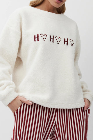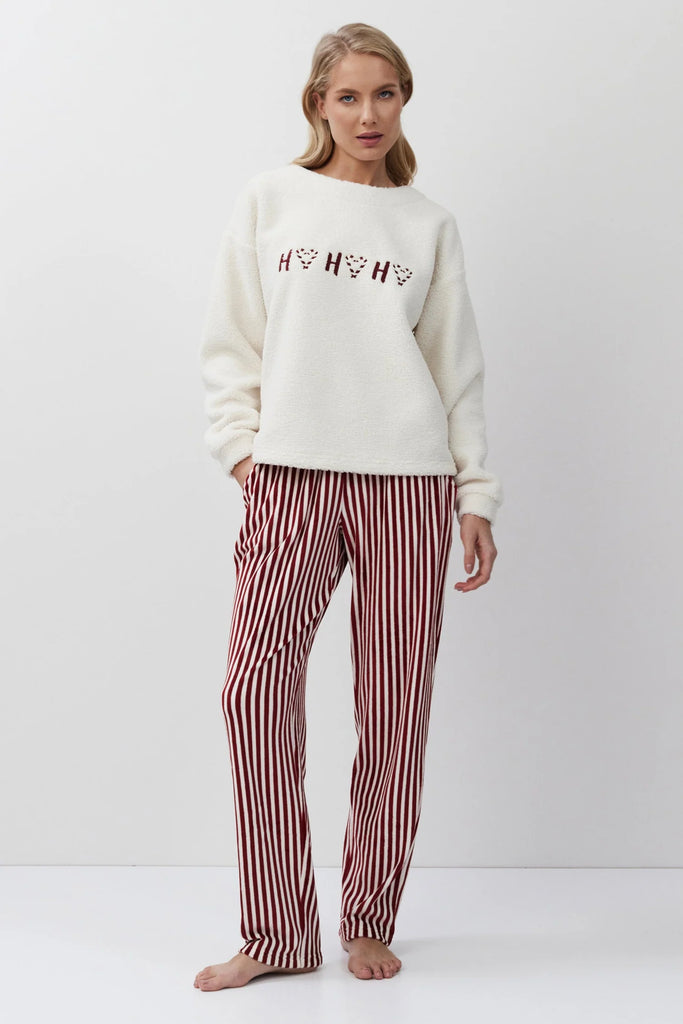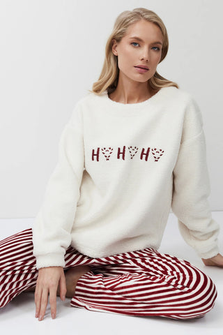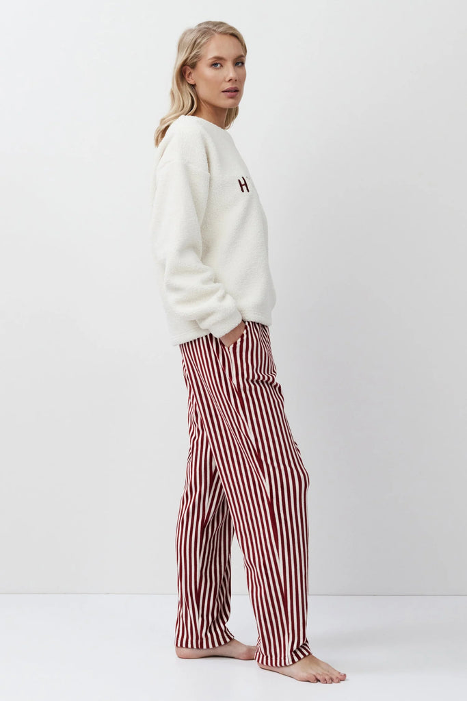 Caldo completo casa che da allegria alle fredde giornate invernali. La maglia girocollo è in felpa bouclè con un ricamo sul petto, i pantaloni di linea dritta a righe sono in morbida ciniglia ed hanno tasche laterali a filo. Un homewear perfetto per un look easy ma particolare
