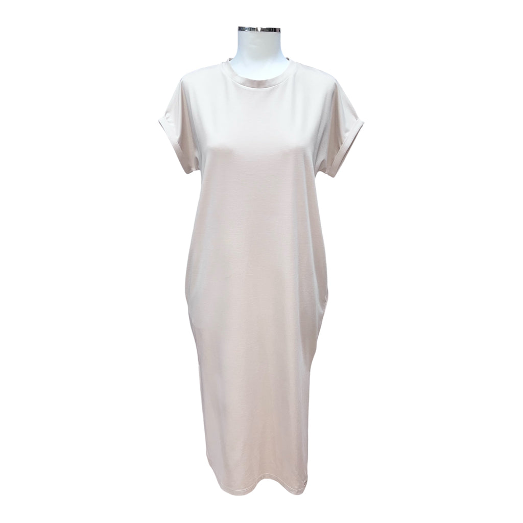 Abito longuette mezza manica con piccolo risvolto, in jersey di viscosa. E' girocollo, ha una linea dritta , tasche a filo laterali e spacchi. Sicuramente un easy chic estremamente facile e fresco da indossare anche con una cintura in vita