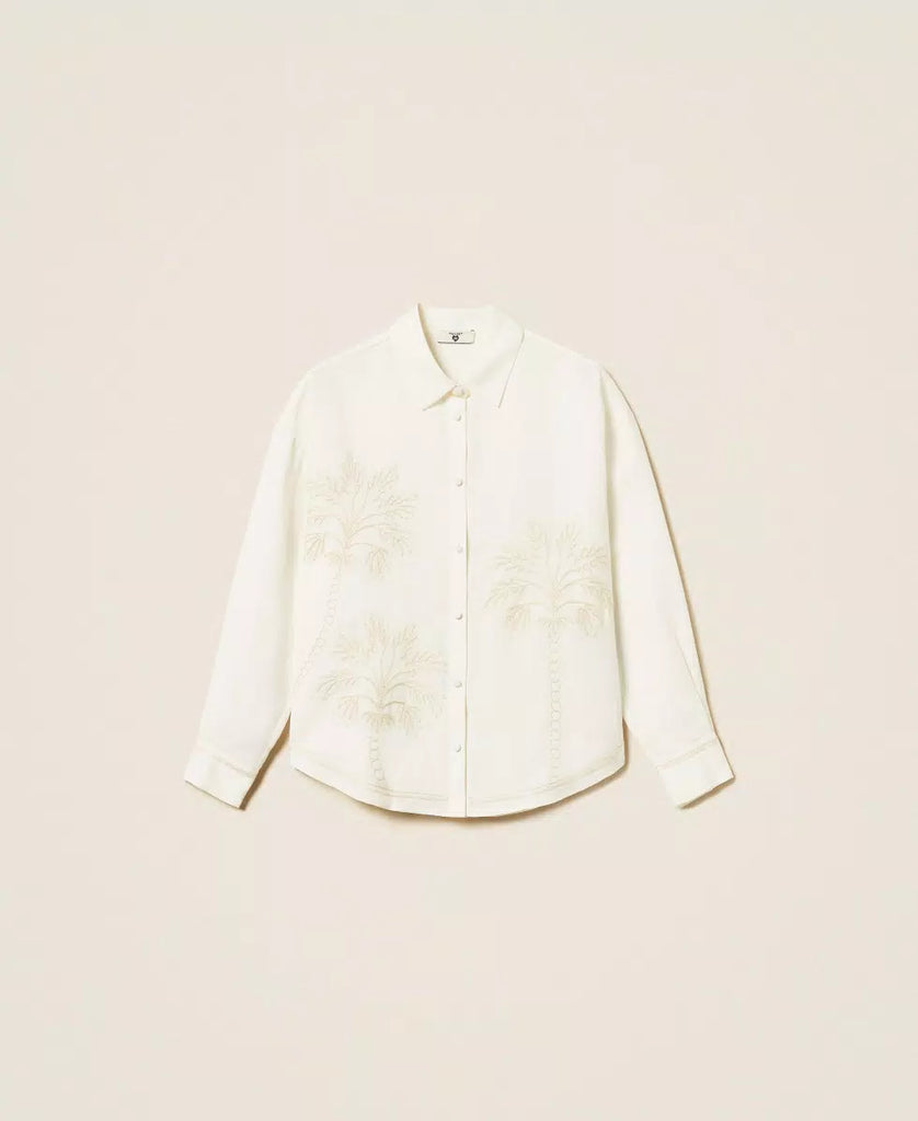 Camicia in misto lino con ricamo esclusivo Twinset di foglie Cornely con filo di spessori diversi e profili rifiniti da ricamo à jour. Ha chiusura con bottoni ricoperti, primo bottone in crochet, maniche lunghe con spalle scese, polsini con bottoni, taglio carré e cannoncino sul retro, fondo asimmetrico e arrotondato ai fianchi, logo a cuore in metallo sul retro, linea morbida.