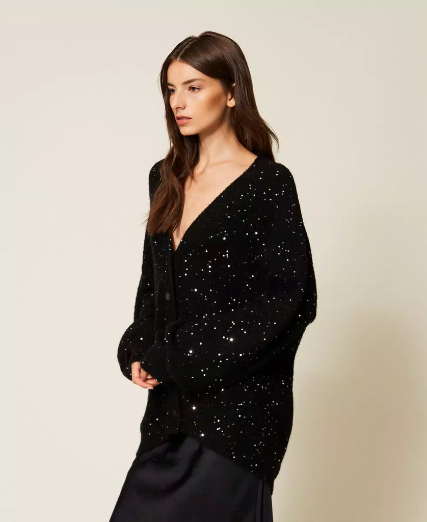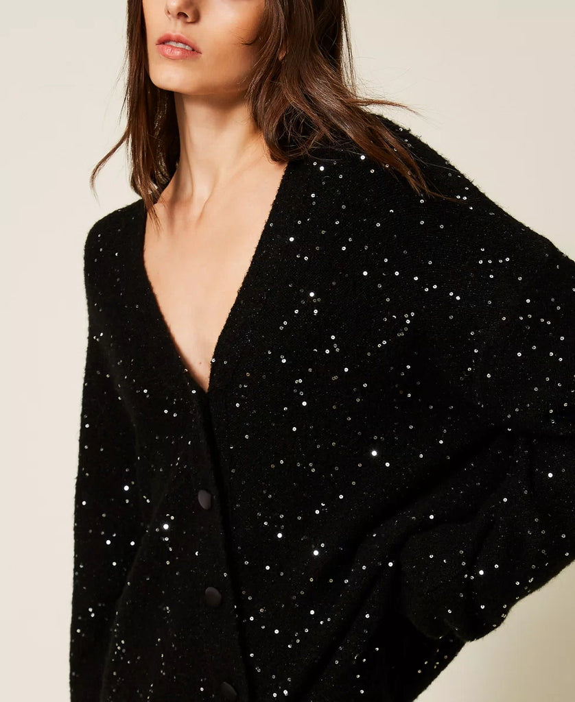 Cardigan in filato di paillettes con scollatura a V, maniche lunghe, chiusura con bottoni in tono, profili rifiniti a costine, placchetta logo a cuore sul retro, linea morbida.