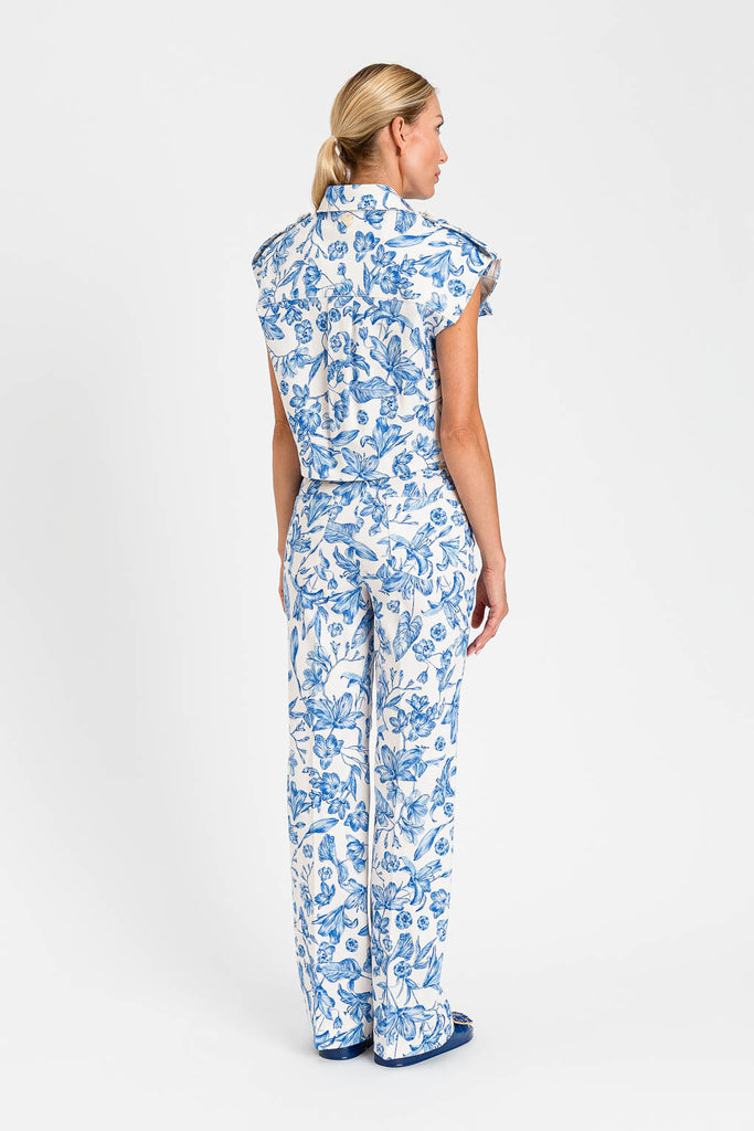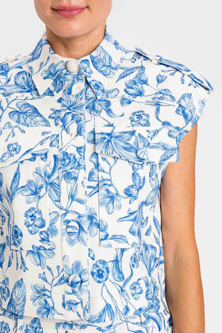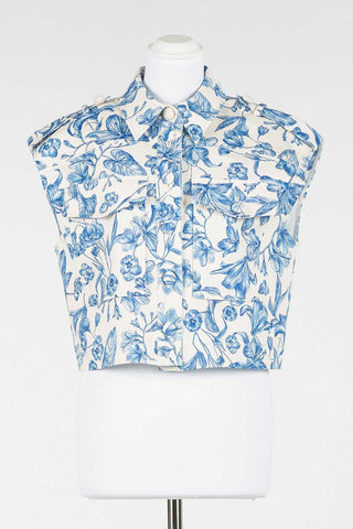 Gilet cropped stampa toile de jouy in tessuto elasticizzato. Ha collo camicia, tasche a toppa davanti e si chiude con bottoni. Sul retro carrè e piegone centrale