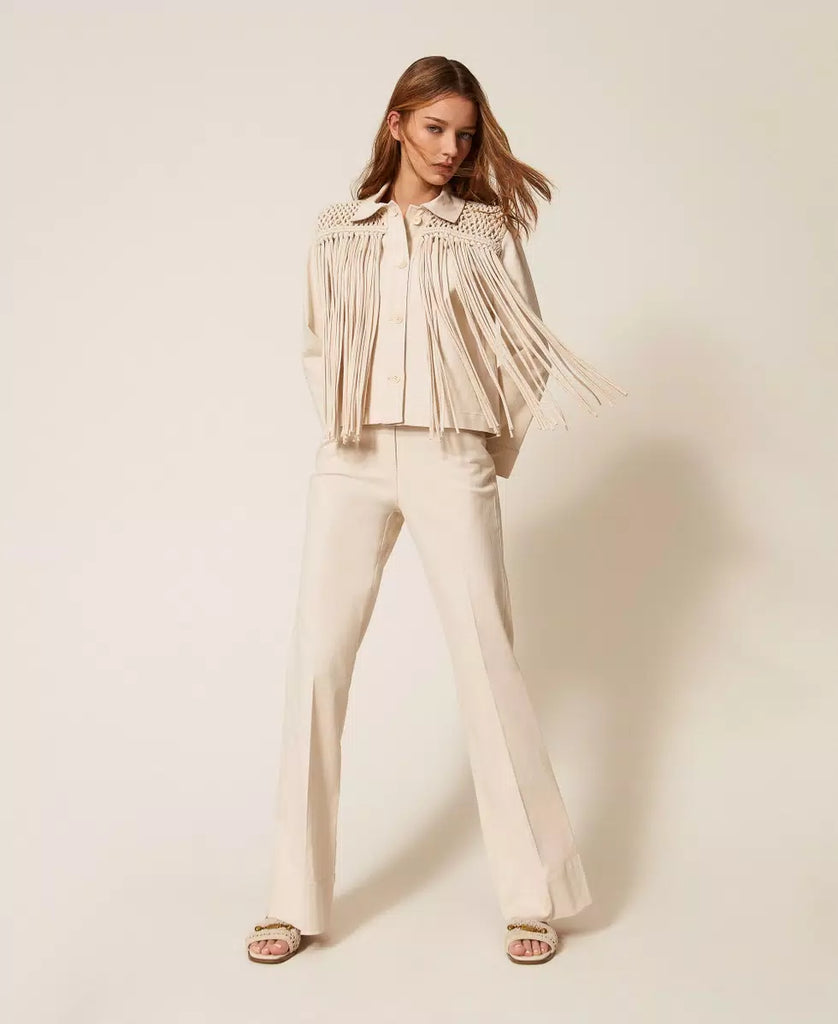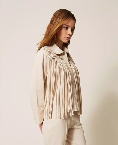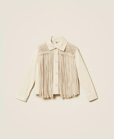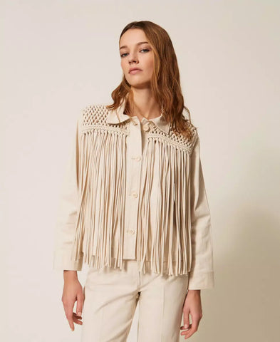 Giacca in bull di cotone stretch con applicazione in jersey a rete al carré con nodi e frange full length davanti. Ha colletto a camicia, chiusura con bottoni in tono, maniche lunghe, logo a cuore in metallo sul retro, linea dritta.
