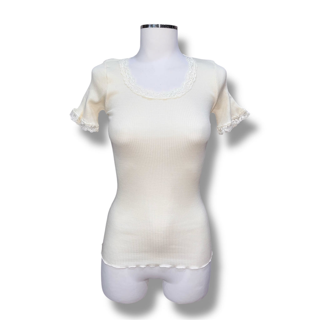 Maglia mezza manica, con pizzo sul girocollo e alle maniche.