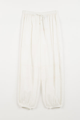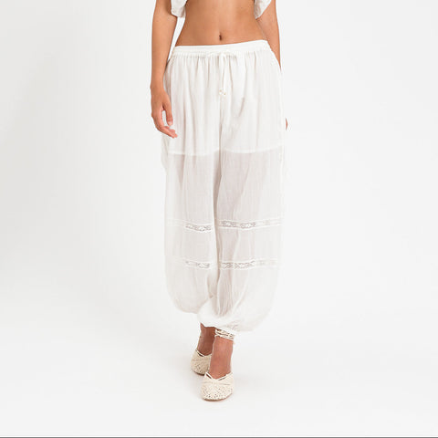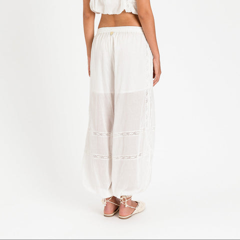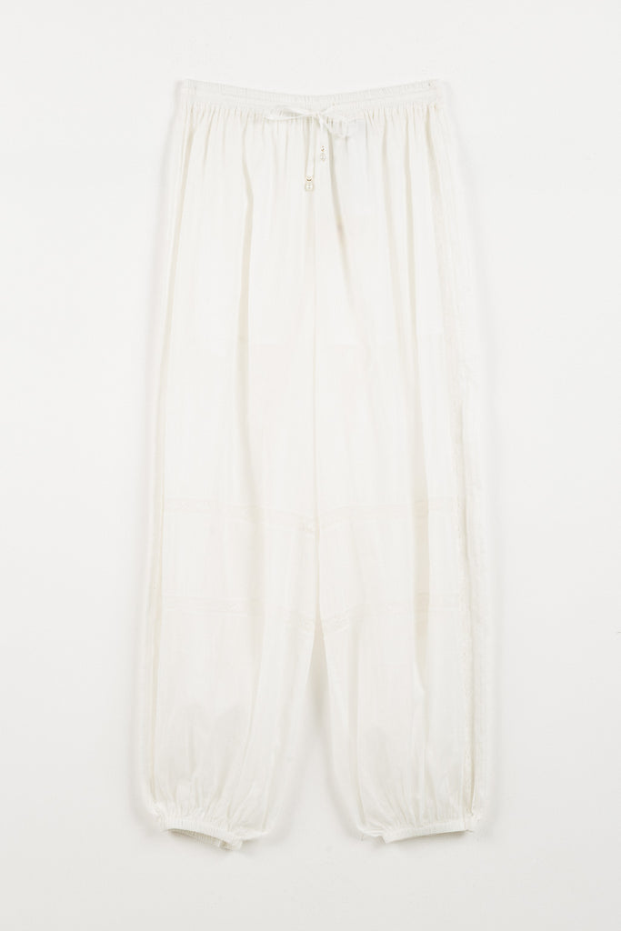 Pantalone in leggerissima mussola di cotone con inserti di merletto.