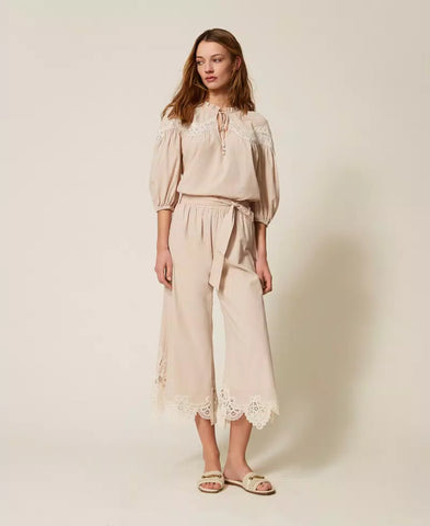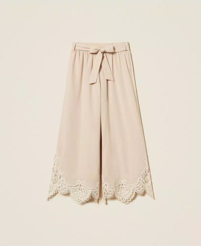 Pantaloni cropped in mussola di cotone con dettagli piazzati in macramè smerlato al fondo. Ha elastico impunturato in vita con passanti, cintura rimovibile da annodare, logo a cuore in metallo sul retro, linea morbida.