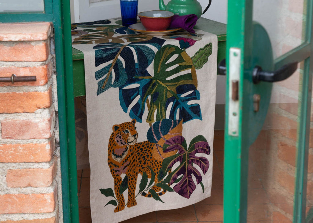Il runner LEOLEAF è un sentiero selvaggio che attraversa la giungla, un corridoio di foglie lucenti intrise di verde, blu e lampi di viola e oro. In questo intreccio tropicale, i leopardi si muovono silenziosi come guardiani di un paradiso nascosto. Ogni dettaglio è un richiamo alla natura più autentica e potente, una fusione di forza e bellezza. LEOLEAF è un'eco della foresta che porta in tavola l'anima calda della giungla.