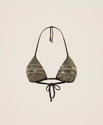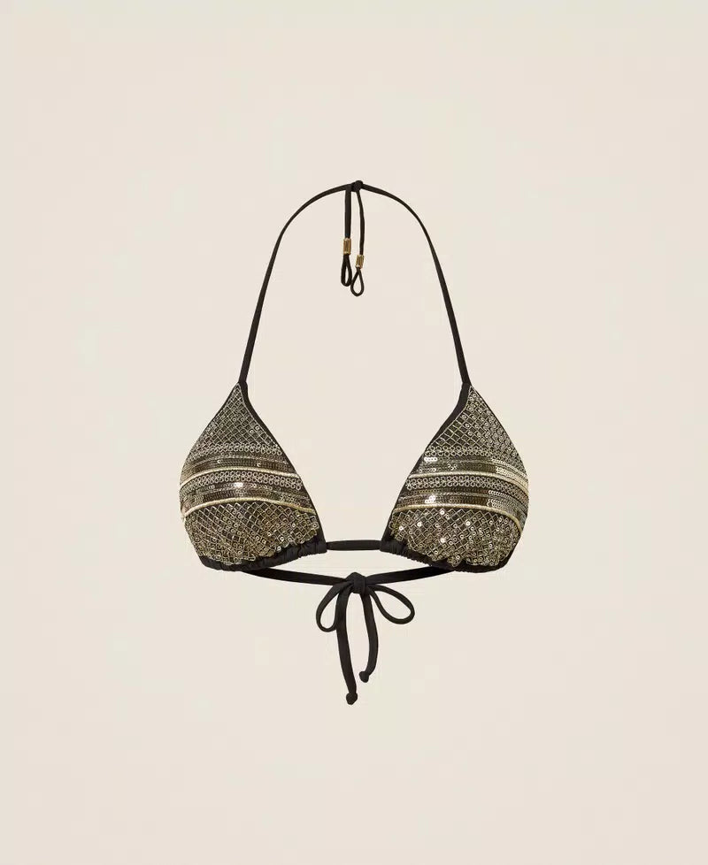 Triangolo da bagno con ricamo di paillettes e filo color oro. È imbottito con coppe estraibili e ha laccetti da annodare dietro al collo o da indossare come spalline grazie alle asole presenti alle estremità, chiusura a fiocco sul retro, fodera interna.