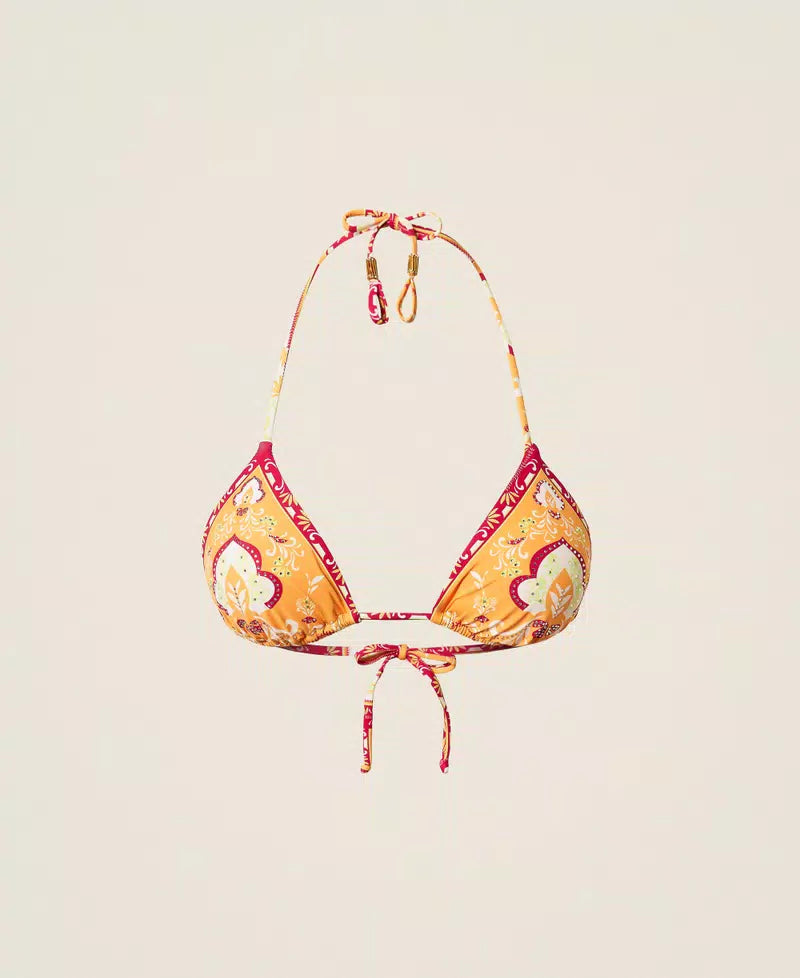 Triangolo da bagno con stampa foulard esclusiva Twinset e applicazione di strass. È imbottito con coppe estraibili e ha laccetti da annodare dietro al collo o da indossare come spalline grazie alle asole presenti alle estremità, terminali in metallo dorato con strass, chiusura a fiocco sul retro, fodera interna.