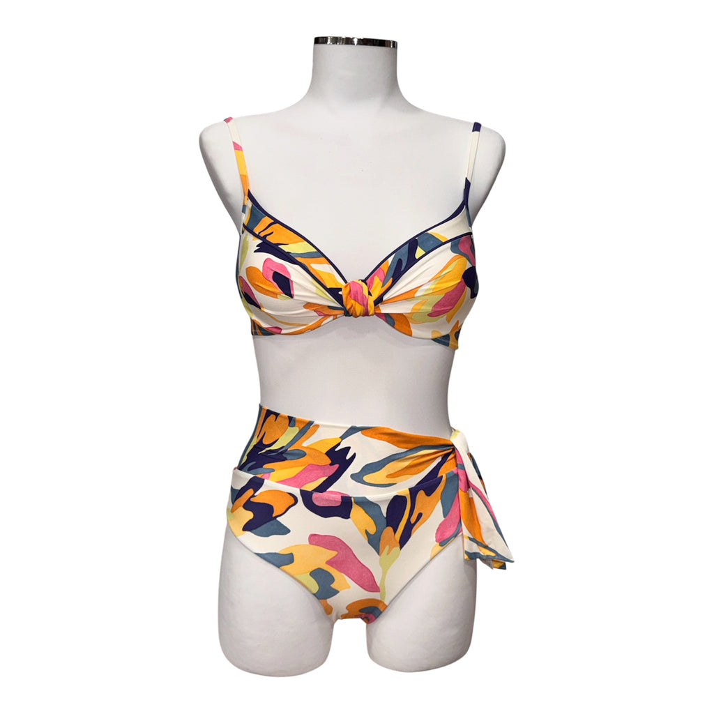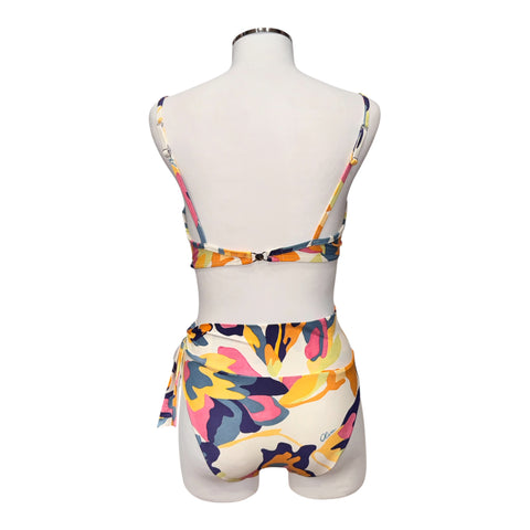 Bikini con coppa fantasia, ferretto sotto seno, bretelle regolabili, chiusura con clip sul retro.