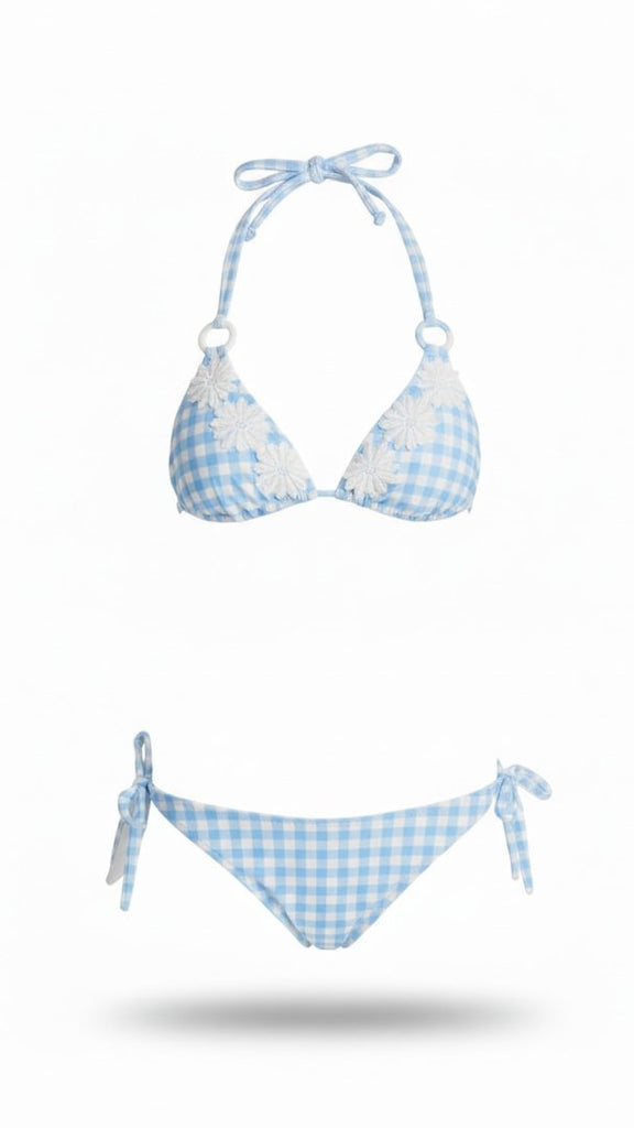 Scopri il bikini triangolo con slip con fiocchi laterali in fantasia vichy a quadrettino, un set dal fascino romantico e dallo stile dolce vita pensato per valorizzare ogni silhouette. Il top a triangolo presenta delicate margherite bianche applicate e raffinati anelli appena sopra il triangolo, dettagli che illuminano il décolleté e rendono questo bikini donna unico e ricercato. L’allacciatura a fiocco dietro il collo e sulla schiena rende il capo facilmente regolabile in base al torace, garantendo comfort e vestibilità personalizzata, mentre l’imbottitura estraibile permette di modulare il sostegno secondo le tue preferenze. Lo slip con fiocchi laterali completa il look con un tocco femminile e regolabile, perfetto per un fit su misura. Triangolo e slip sono venduti insieme come set bikini coordinato, ideale per mare e piscina. Per preservare qualità ed elasticità del tessuto si consiglia il lavaggio a mano.