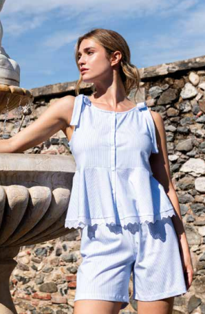 Il top ha le bretelle che si chiudono con un fiocco sulle spalle, è completamente abbottonato ed ha una balza alta sul fondo che crea una sorta di godet con un profilo in sangallo. La vestibilità è morbida.