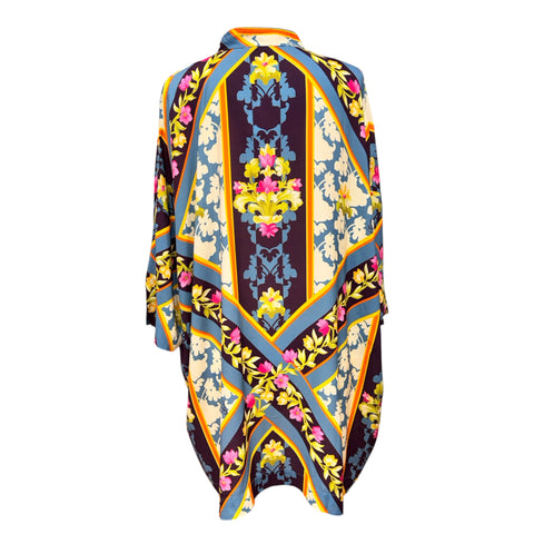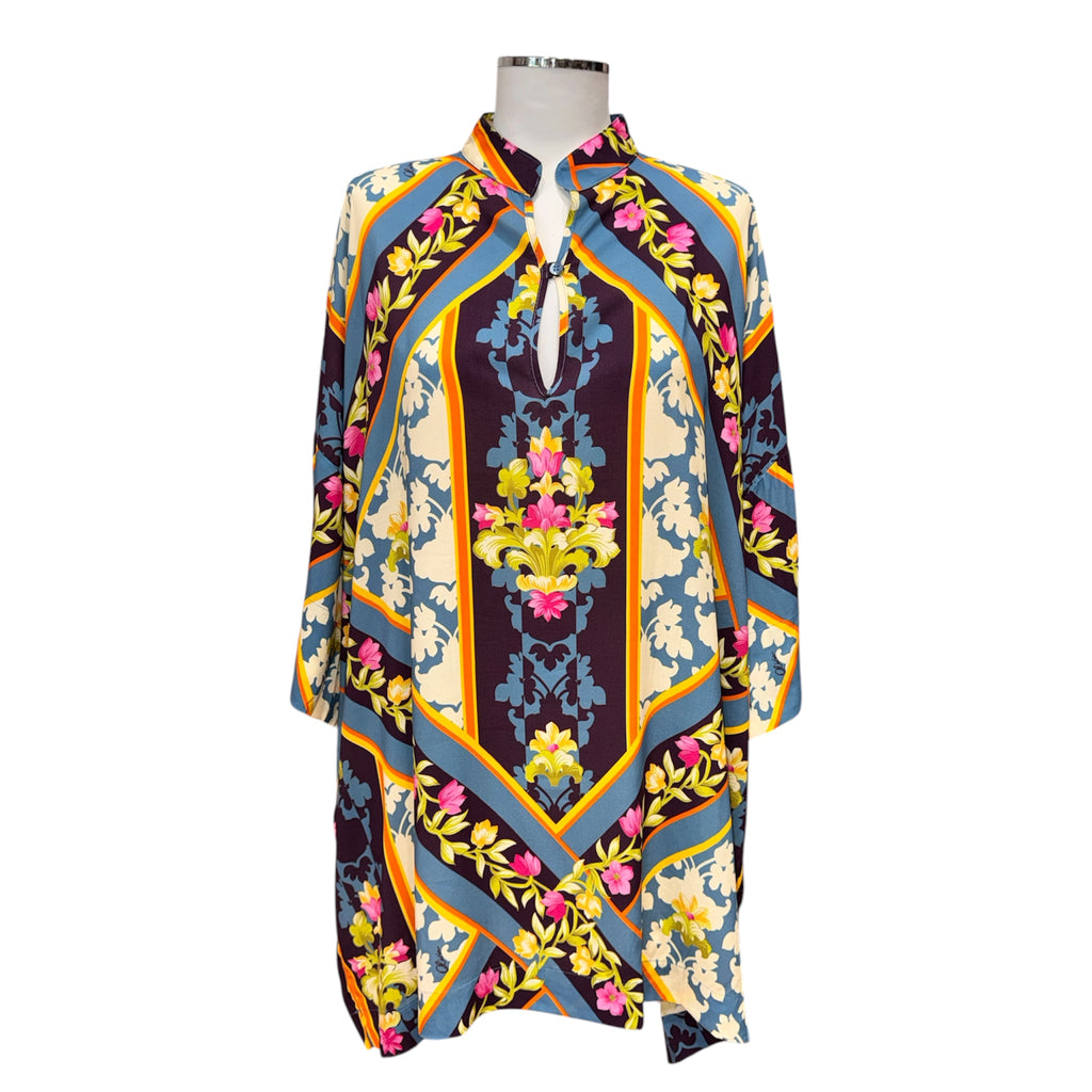 Ha il collo alla coreana, un'apertura a goccia centrale fermata da un bottoncino -Manica scesa - Stampa piazzata - Vestibilità over - Lunghezza 83 cm.