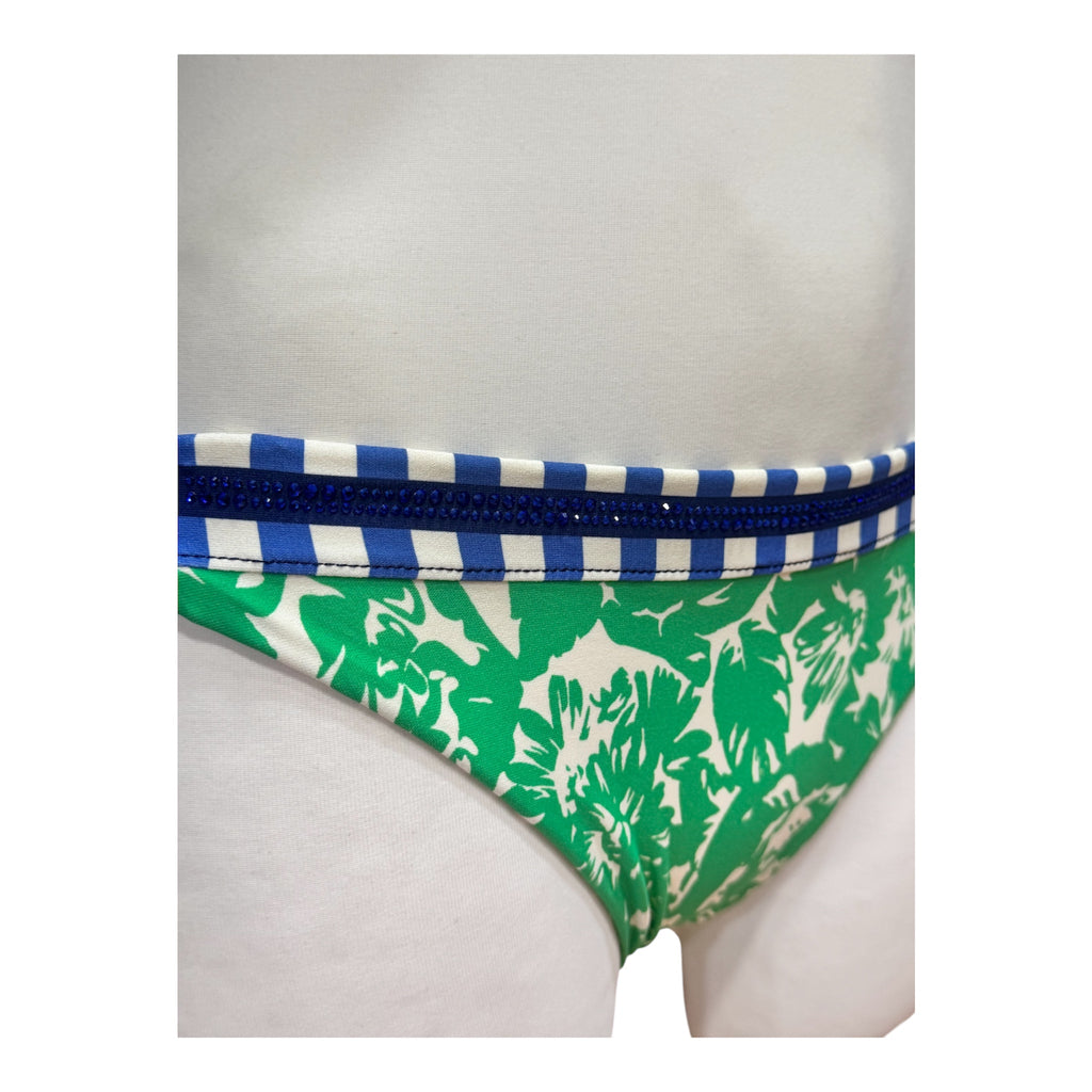 Lo slip ha fiocchi laterali e taglio brasiliano, è senza cuciture ed ha un bordo in contrasto a righe con un'applicazione di strass