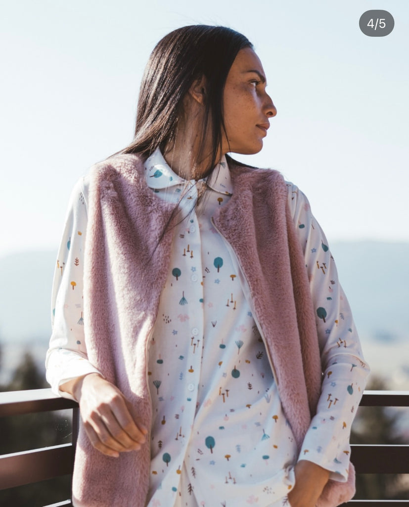 Bellissimo completo con stampa all over con deliziosi alberelli stilizzati. La vestibilità è tipica del pigiama elegante da uomo reso più femminile da un piccolo collo stondato. Il tessuto è un jersey stretch con smeriglio al carbonio, piacevole da indossare a diretto contatto con la pelle in linea con le nuove esigente per affrontare inverni sempre più caldi e miti.