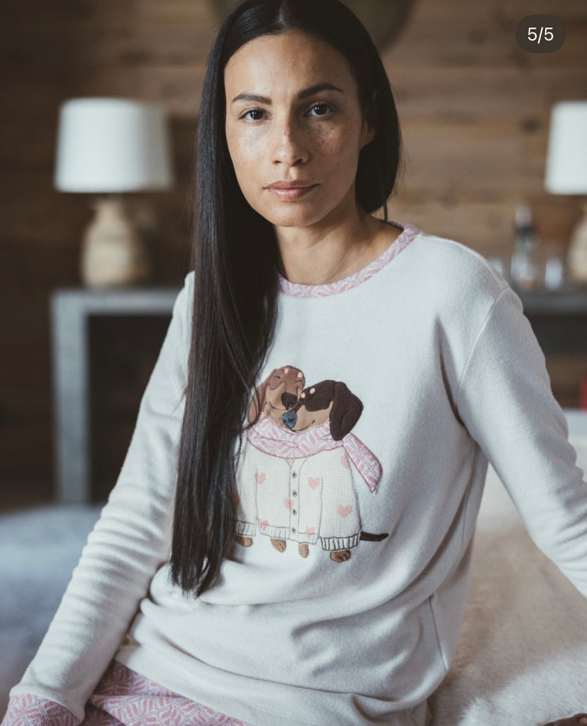 Completo da casa invernale da donna in tessuto punto Milano con maglia unita e pantalone jacquard con tocco di lurex prodotto nei nostri stabilimenti. Questo completo pratico e caldo ha un’ottima vestibilità: la maglia ha il collo e i polsi in contrasto con una vestibilità morbida dove troviamo due deliziosi cagnolini applicati a ricamo. Il pantalone lungo è a gamba dritta e piuttosto larga. Questo articolo si abbina alla nostra proposta di coperte Maryplaid.
