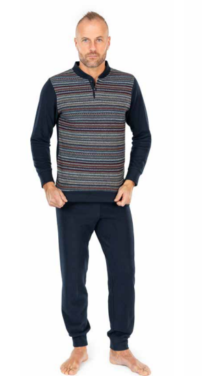 Pigiama serafino in punto milano con maglia operata multicolor effetto righe. La maglia è serafino con piccola pistagna e i pantaloni sono in tinta unita con polsini alla caviglia.
