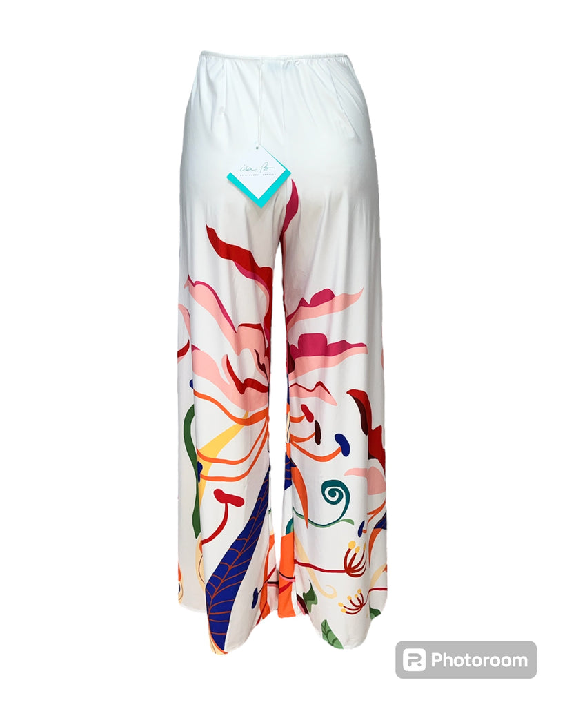 Pantalone fantasia in jersey. Ha l'elastico in vita, un disegno piazzato sul fondo e una linea palazzo.