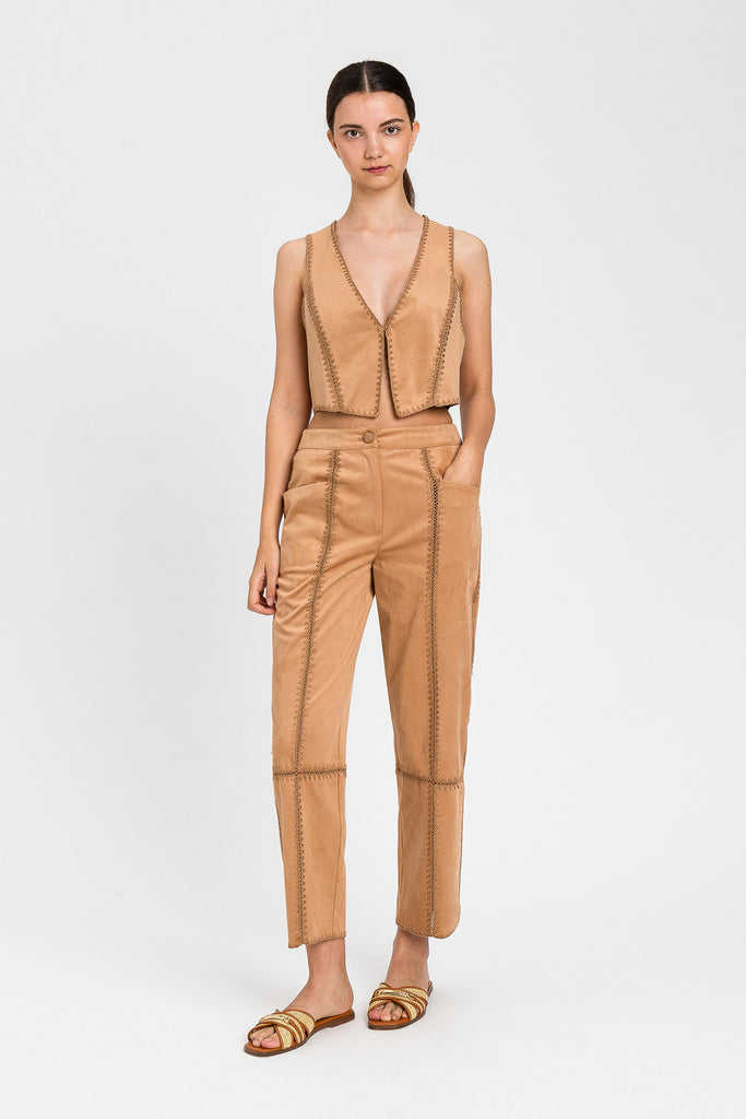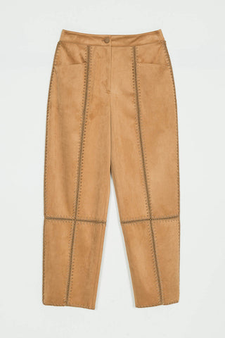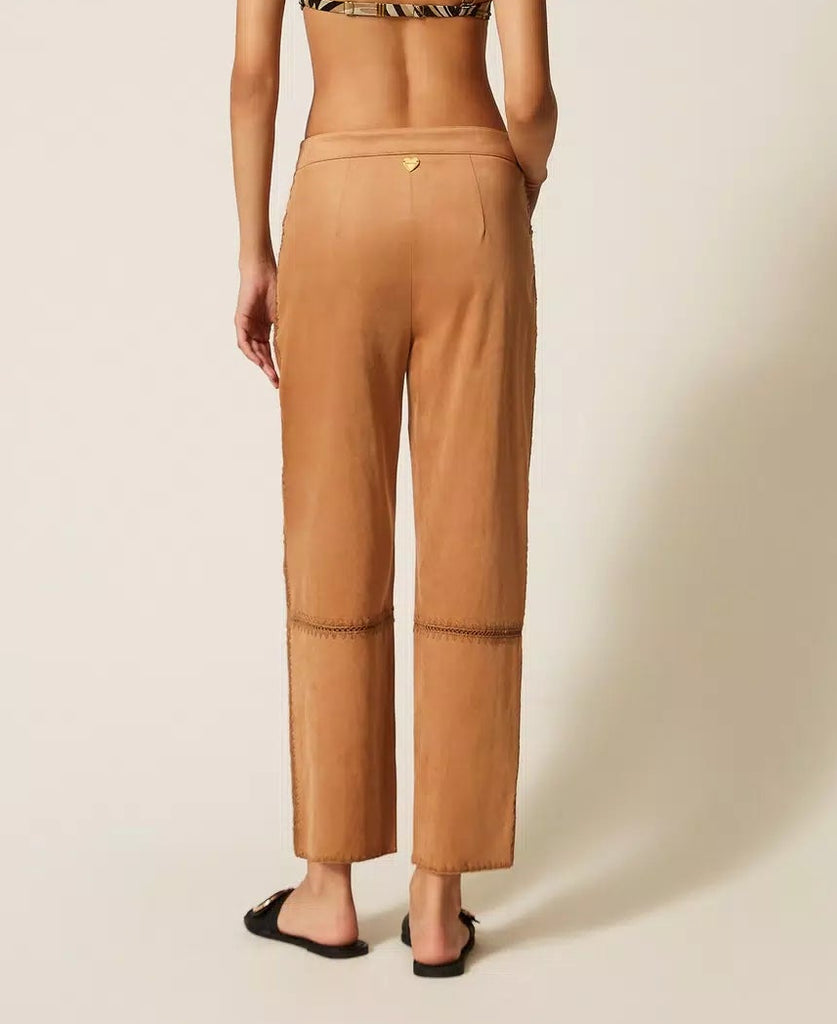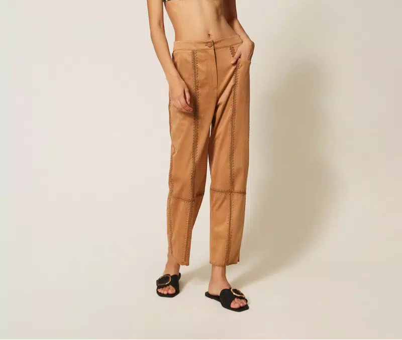 Pantalone in tessuto effetto pelle scamosciata con ricamo punto sella che oltre a rifinire il capo crea dei giochi di trasparenze. Ha chiusura con zip e bottone crochet in tinta, tasche davanti, logo a cuore in metallo sul retro, linea morbida.