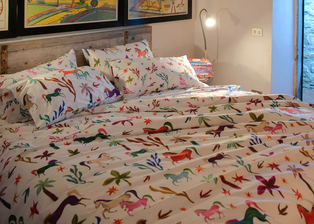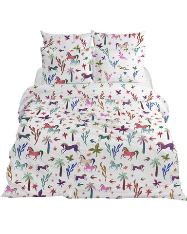 Il set piumino AGNES in 100% cotone percalle è un inno alla libertà e all'immaginazione, porta in camera un soffio di fantasia e trasforma il letto in un palcoscenico di storie da inventare. I cavalli stilizzati galoppano in un paesaggio da sogno, tra palme esotiche e fiori dai colori brillanti. Ogni pennellata sembra rubata a un dipinto moderno, dove il viola incontra il turchese e il corallo danza con il verde.