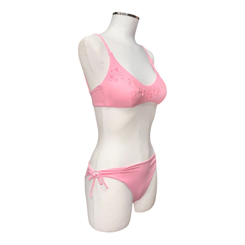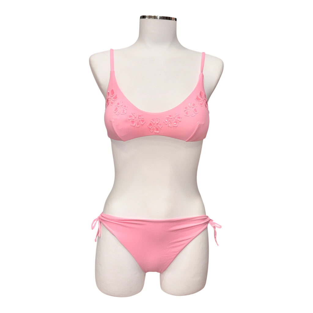 Bikini a brassiere tinta unita con applicazione di fiori in lycra lucida
