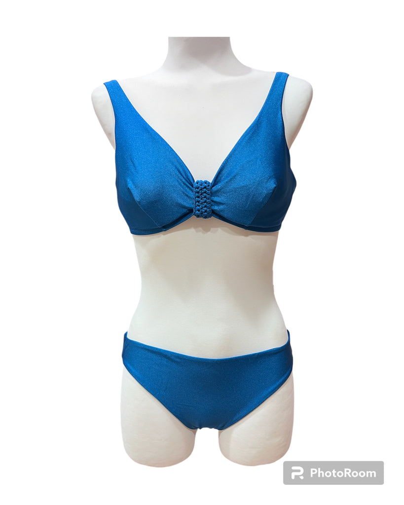 Il bikini con ferretto e intreccio è l'ideale per un look seducente e confortevole. Con il ferretto sotto seno, il nodo centrale e le bretelle regolabili, offre sostegno e comfort. La chiusura con clip sul retro e lo slip continuo con fianchino più alto aggiungono un tocco glamour. Realizzato in lycra lurex per una vestibilità perfetta.