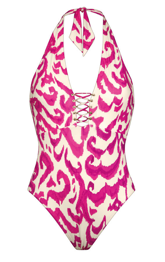 Costume intero fantasia con scollatura profonda, intreccio centrale e ganci dorati.