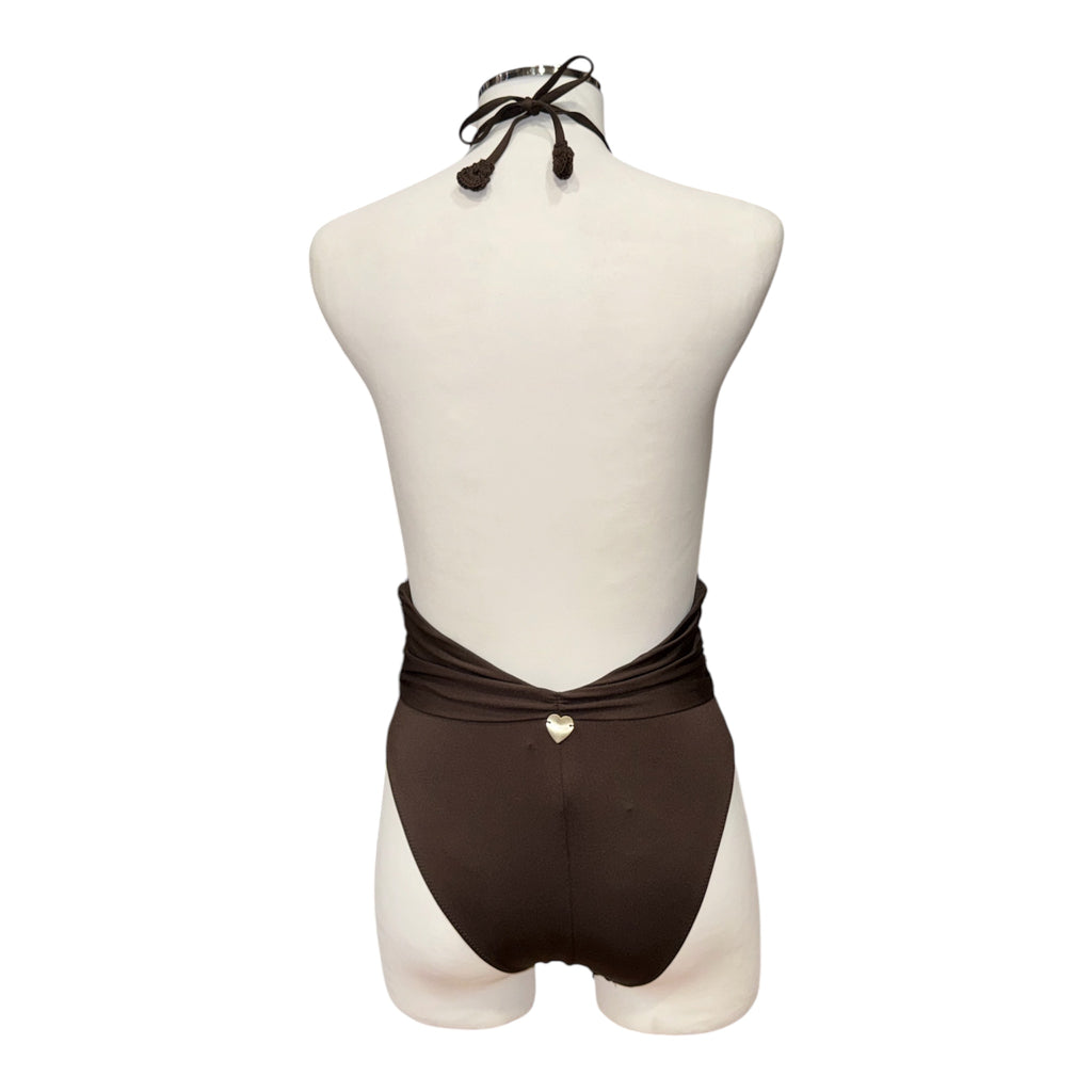 Costume intero in tessuto satin con spilla rimovibile a fiore lavorata a crochet. Ha coppe arricciate con apertura profonda, inserti drappeggiati che definiscono il punto vita, chiusura con laccetti dietro il collo, schiena scoperta, logo a cuore in metallo sul retro.