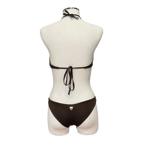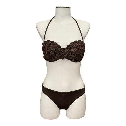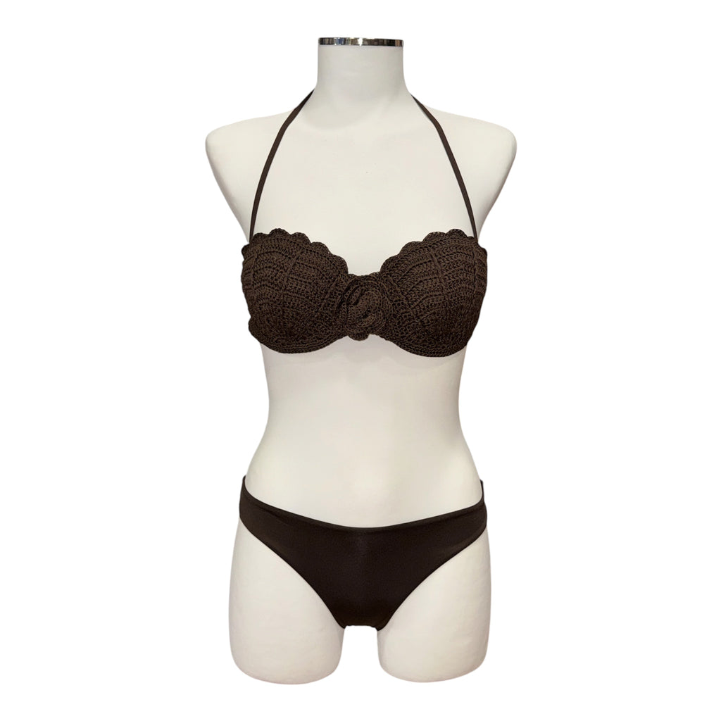 Bikini composto da fascia da bagno in crochet di cotone con lavorazione effetto conchiglia e brasiliana in tessuto satin con logo a cuore in metallo sul retro. Ha coppe sagomate e smerlate, spilla a fiore rimovibile al centro, laccetti rimovibili da annodare dietro al collo o da indossare come spalline grazie alle asole presenti alle estremità, fodera e chiusura a fiocco sul retro.